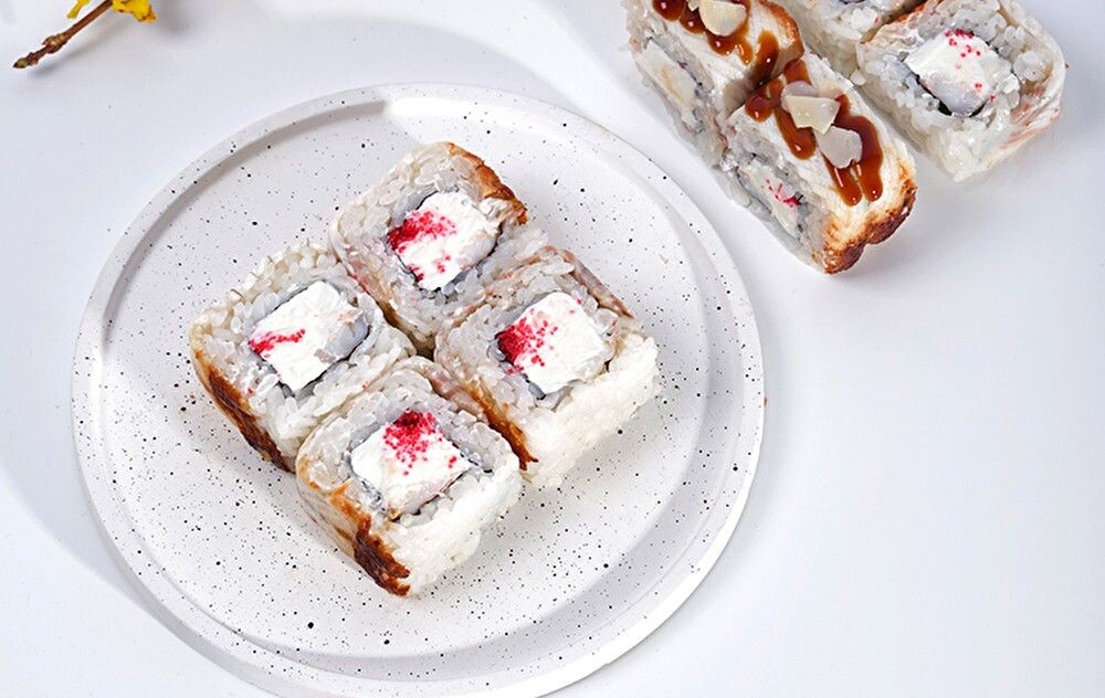 Угорь, икра, сыр филадельфия, креветка, соус унаги, миндаль