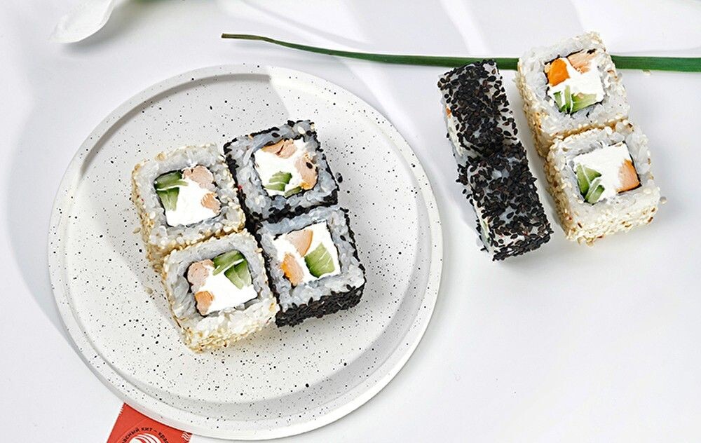 Кунжут, копчёная курица, свежий огурец, сыр филадельфия