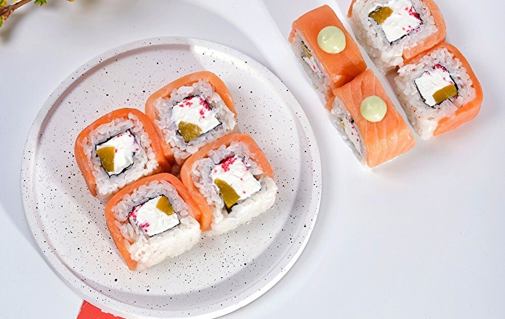 Лосось, сыр филадельфия, икра, персик, соус васаби